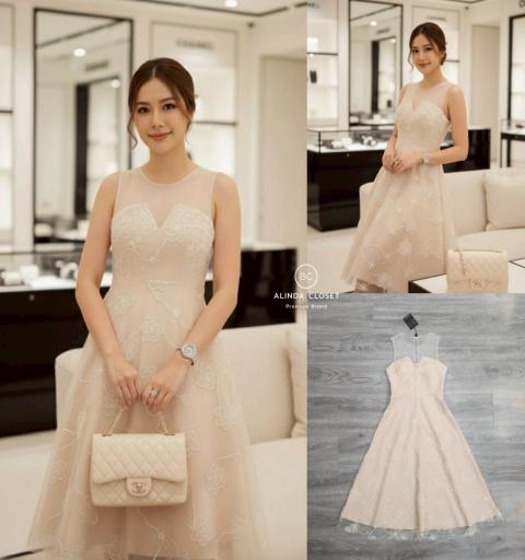 เดรสยาวสีครีมผ้าลูกไม้ลายดอกไม้มีเท็กเจอร์ในตัว