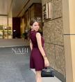 จั้มสั้นสีแดงไวน์ ดีไซน์คอวีทรงปล่อย แต่งกระเป๋าช่วงอกและเย็บจีบช่วงขา