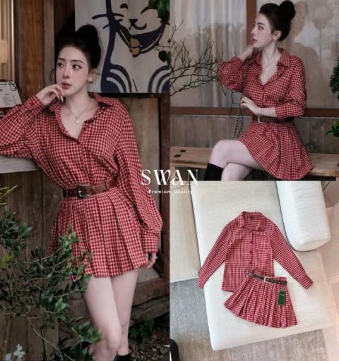 Set 3 ชิ้น เสื้อเชิ้ต + กระโปรง + เข็มขัด ดีไซน์ผ้าลายตารางโทนแดงสุดคลาสสิก