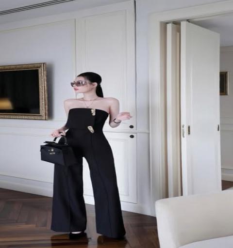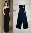 จั้มสูทเกาะอกสีดำ ดีไซน์ท่อนบนตัดแบบโอเวอร์เลย์ซ้อนชั้นเพิ่มมิติ