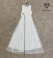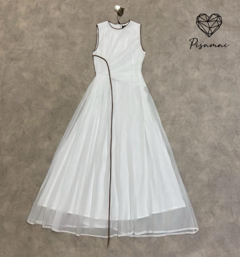 เดรสแขนกุดสีขาวแต่งดีเท็ลจีบย่นช่วงเอว สีเส้นลายสีน้ำตาลตัดขอบ