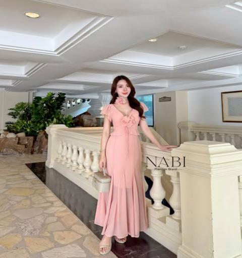 Maxi dress ผ้าชีฟองแขนระบาย มีซับในและฟองน้ำ งานซิบหลัง ชุดทรงแขนระบายและแต่งระบายใต้อก