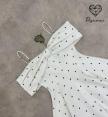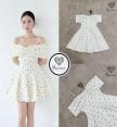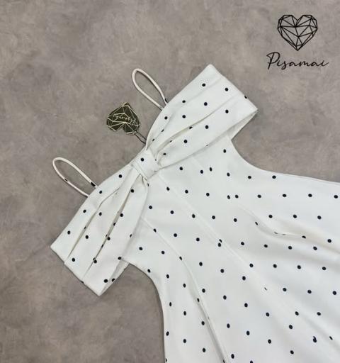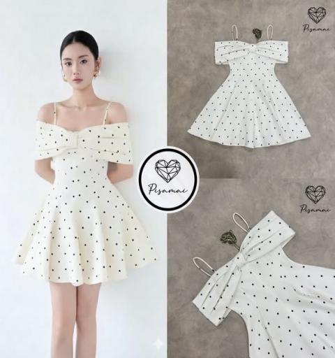 เดรสแขนกุดตัวสั้นสีครีมลายจุด polkadot จุดทรงเปิดหัวไหล่