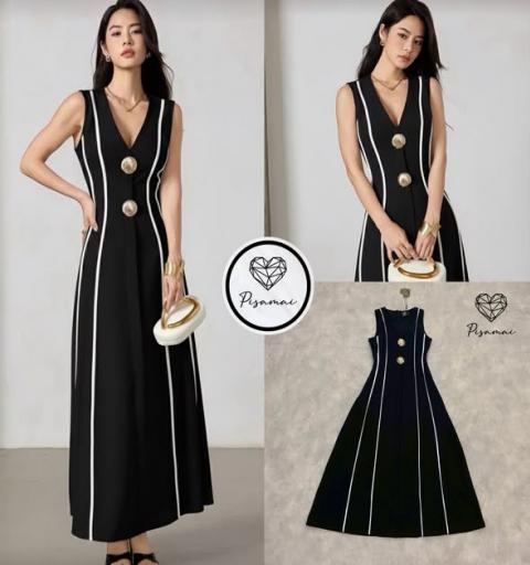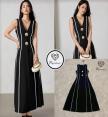 เดรสแขนกุดตัวยาวสีดำแต่งลายเส้นนูนสีขาว