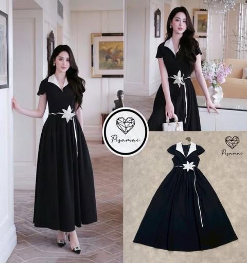 เดรสคอปกทูโทนขาวดำตังยาวบาน มาพร้อมเชือกสามารถพันไขว้เป็นดีเท็ลเก๋