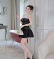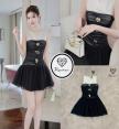เดรสตัวหนอนดำตัวสั้นแต่งซีทรูช่วงอกสีขาว ด้านหน้าแต่งอะไหล่ทอง