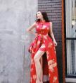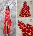 เดรสกี่เพ้าแขนกุดตัวยาวสีแดงพิมลายนกสีทอง