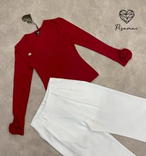 เซ็ตเสื้อแขนยาวสีแดงช่วงแขยแต่วดีเท็ลดอกกุหลาบ