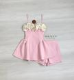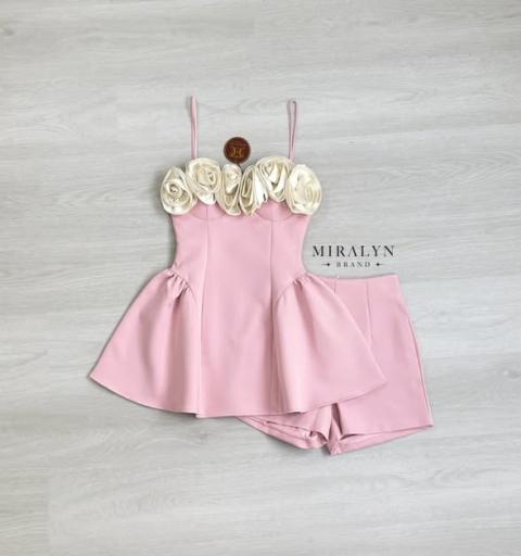 มินิเดรสสายเดี่ยวสีชมพูแต่งดอกไม้สีครีมช่วงอกแบบสวยน่ารัก