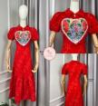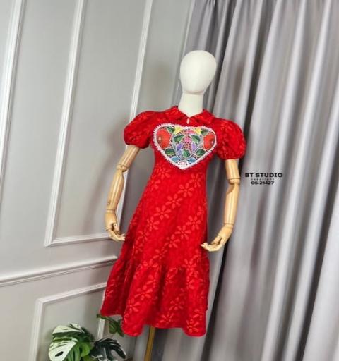 เเดรสยาวแต่งแขนสั้นพองๆ คอปกตรงกลางปักลายดอกไม้