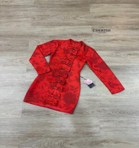 เดรสพิมพ์ลาย แต่งโบว์เย็บเรียง 10 ชั้น แอบแหวกช่วงอกเล็กน้อย
