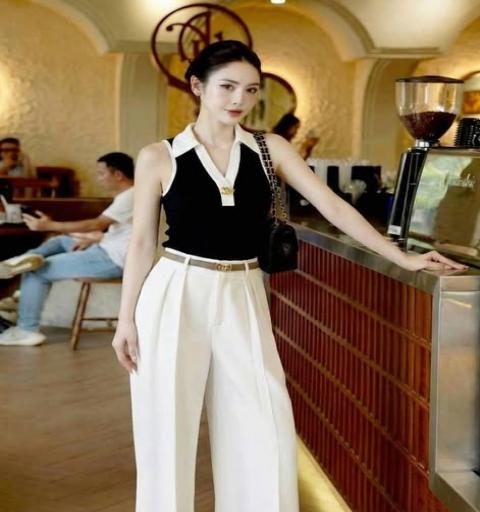 เสื้อทรงโปโลดีไซน์หรู ผ้าดีใส่สบาย แมตช์คู่กับกางเกงทรงกระบอกกลางที่ช่วยให้ขาดูยาวสวย