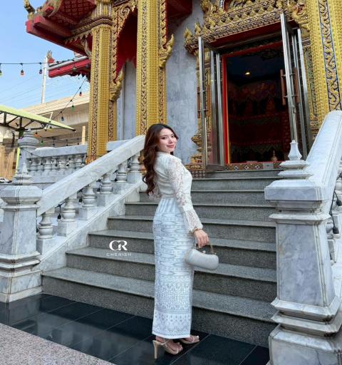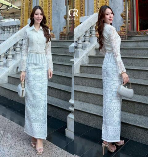 𝘿𝙚𝙩𝙖𝙞𝙡𝙨 :: ชุดงานบุญ เซ็ท 3 ชิ้น เสื้อลูกไม้คอปกแขนยาวปลายแขนระบาย ช่วงอก จับจีบแนวตั้ง แต่งกระดุมหน้าเม็ดใหญ่ ถอดได้จริง มาพร้อม กระโปรงผ้าพิมพ์ลายและเข็มขัดมุกเข้าชุดกัน มีซับในทั้งตัว เป็นชุดไทยประยุกต์ที่มีความสุภาพ อ่อนหวาน และดูภูมิฐาน โดยเป็นการผสมผสานระหว่างงานลูกไม้แบบตะวันตกและผ้าทอพื้นเมืองได้อย่างลงตัว