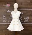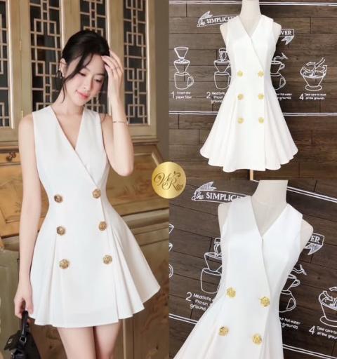เดรสแขนกุด คอวีป้าย ติดกระดุมดอกไม้สีทอง ซิปหลัง