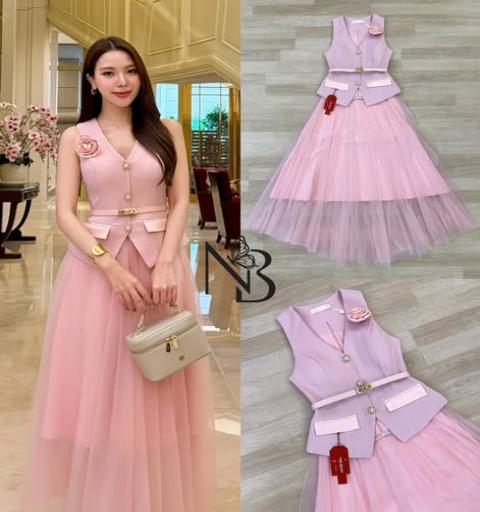 ชุดเซ็ต 2ชิ้น เสื้อแขนกุดคอวี แต่งกระดุมมุกด้านหน้า