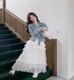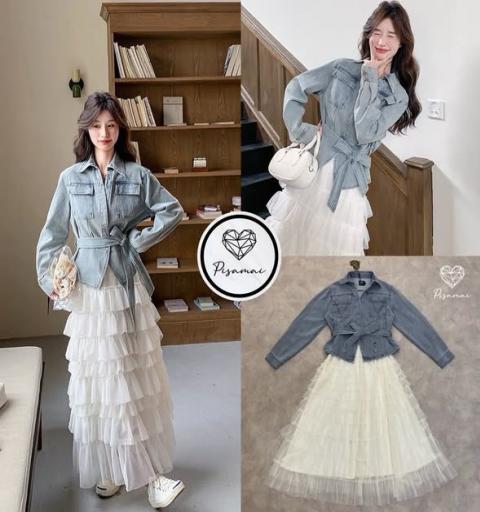 เซ็ตเสื้อยีนส์ฟอกคอปกแขนยาว มาคู่กับกระโปรงสีครีมชั้นระบาย พร้อมเชือกเข้าเซ็ต