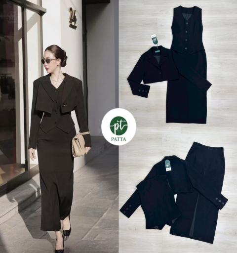 เซต3ชิ้น สีดำ เสื้อคลุมแขนยาวตัวสั้นมีกระดุมหน้า