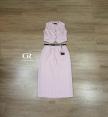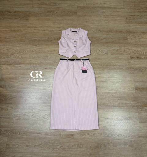 ชุดเซ็ท 3 ชิ้น เสื้อ+กระโปรง+เข็มขัด ตัวเสื้อกั๊กลายริ้ว แขนกุดคอวี