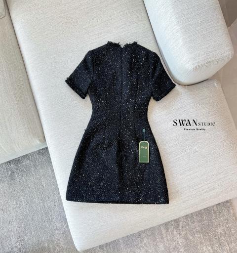 มินิเดรสผ้าทวิตสีดำ แต่งตัดด้วยกระดุมหลอกสีทอง ซิปหลังใส่ง่าย