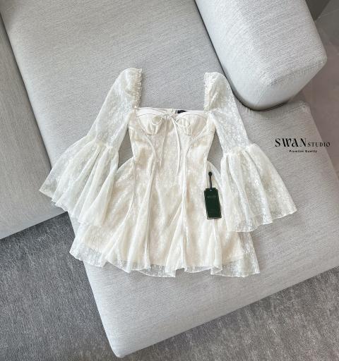 เดรสแขนยาวผ้าลูกไม้โทนครีม ดีไซน์คอเหลี่ยมพร้อมเชือกผูกอกเพิ่มความหวานละมุน ตัวเดรสเข้ารูปช่วงเอวช่วยเก็บทรงให้ดูเพรียว