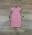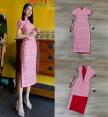 เดรสยาวคอจีน แต่งกุ๊นแดงสลับชมพูทั้งชุด กระโปรงผ่าข้างขึ้นมาสูง