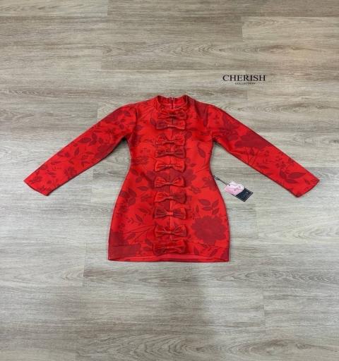 เดรสพิมพ์ลาย แต่งโบว์เย็บเรียง 10 ชั้น แอบแหวกช่วงอกเล็กน้อย