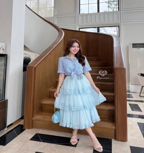 เซ็ตเสื้อเชิ้ตคอปกสีฟ้า มาคู่กับกระโปรงลายสก็อตสีฟ้าชั้นฟู สวยฟูฟ่อง