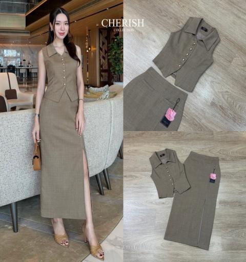 ชุดเซ็ท สาวใสวัยทำงาน เสื้อ+กระโปรง ตัวเสื้อกั๊กตกแต่งกระดุมสุดคลาสสิค