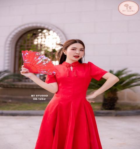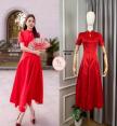เดรสแต่งปกคอจีนเว้ากลางอกเล็กน้อยแต่งกระดุมพู่จีน แขนสั้น