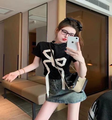 เสื้อ+กระโปรง.กางเกง เสื้อสีดำเนื้อผ้าร่อง ดีเทลด้านหน้าแต่งรูปโบว์ตั๊กล๊ากก