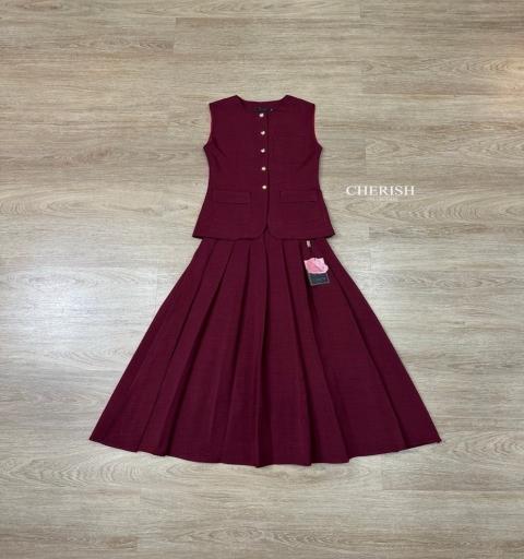 ชุดเซ็ทสุดหรู เสื้อ+กระโปรง เซ็ทนี้ ตัวเสื้อแขนกุดตัวยาวตกแต่งกระดุมพร้อมกระเป๋าใช้งานได้จริง