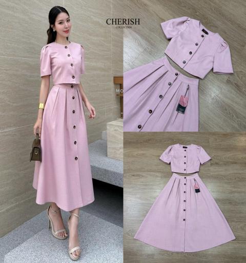 ชุดเซตที่สุดของความคลาสสิค ตัวเสื้อครอปคอกว้างแขนสั้นตกแต่งกระดุม