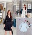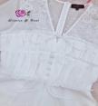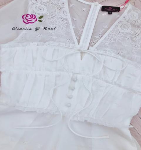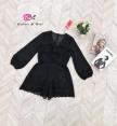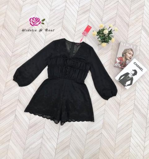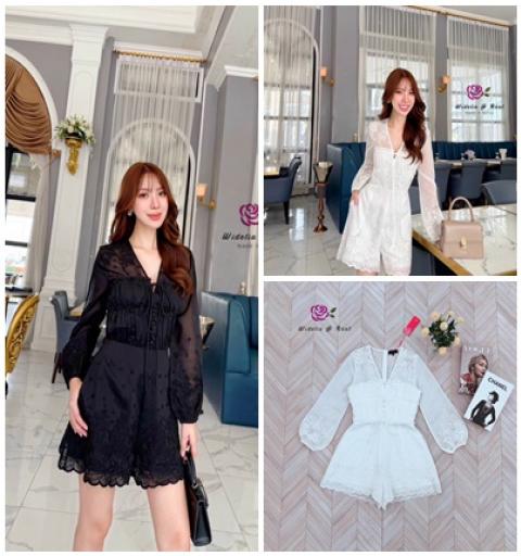 จั้มสูทขาสั้น แขนยาว เนื้อผ้าฉลุปักลูกไม้ทั้งตัว อกผูกโบว์ คอวี แต่งกระดุม