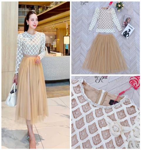 Set เสื้อลูกไม้แขนยาวกับกระโปรงยาว มีเข็มกัดดอกไม้ให้ 1 ดอก