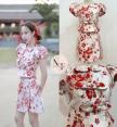 Set 2 ชุด งานผ้าทอลายดอกไม้สีแดง เสื้อแขนตุ๊กตา แต่งดีเทลโบว์ด้านหน้า