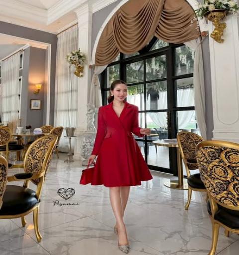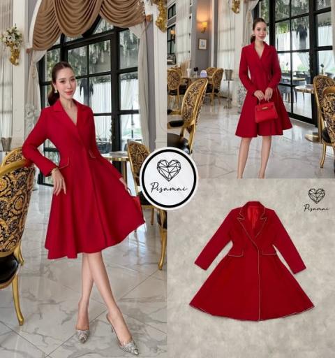 เดรสสูท5ส่วนสีแดงแขนยาว คอปก ช่วงขอบแต่งเพชรวิ๊งๆ