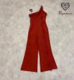 จั้มสูทไหล่เดียวขายาวสีแดงอมส้มแต่งดีเท็ลระบาย มาในดีไซน์เรียบหรู