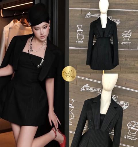 Set เสื้อคลุมตัวสั้น+เดรสตัวสั้นสุดชิค เสื้อคลุมแขนยาวแต่งปก พร้อมกระดุมเม็ดเก๋