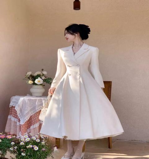 เดรสสูทตัวยาวสวยทรงเก๋ ท่อนแขนยาว ด้านหน้าแต่งกระดุมสีทอง คอปกสวย