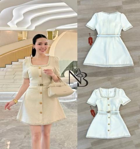 เดรสแขนสั้นผ้าทวิตทรงกระโปรงบาน ดีไซน์แต่งเพรช แต่งกระดุมสีทองด้านหน้า