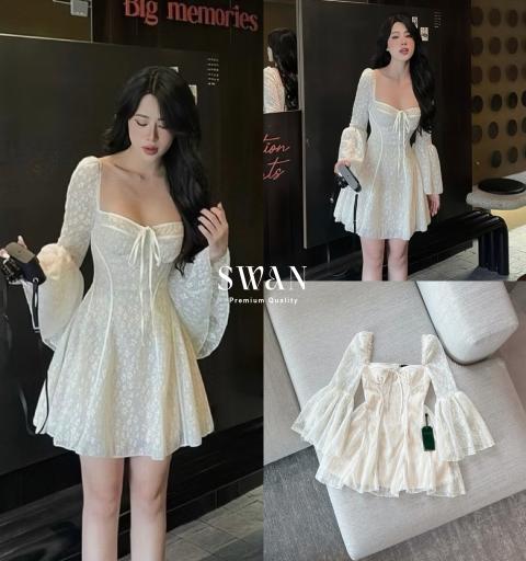 เดรสแขนยาวผ้าลูกไม้โทนครีม ดีไซน์คอเหลี่ยมพร้อมเชือกผูกอกเพิ่มความหวานละมุน ตัวเดรสเข้ารูปช่วงเอวช่วยเก็บทรงให้ดูเพรียว