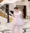 เดรสแขนกุดตัวยาวงานลูกไม้ฉลุสีชมพูตัวสั้น ต่อชายซีทรูคลุมตัวยาว