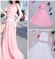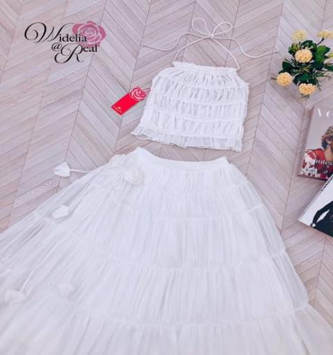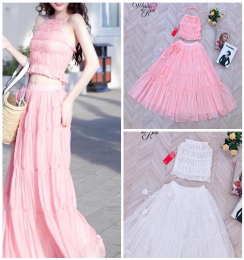 Set เสื้อคล้องคอกับกระโปรงยาว เย็บเอกไม้ด้านข้าง เนื้อผ้าสีพื้น เย็บจีบย่นมาทั้งตัว