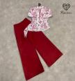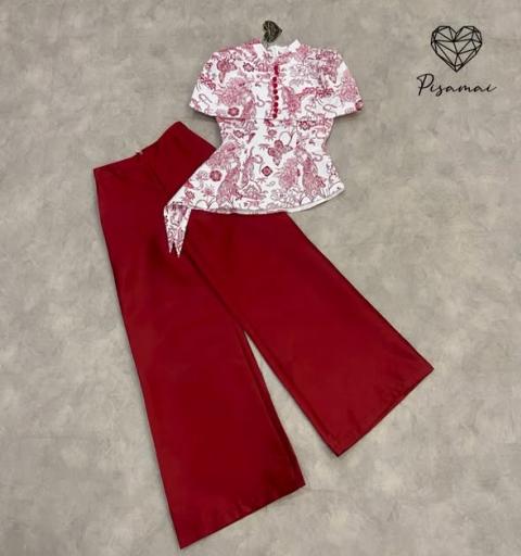 เซ็ตกี่เพ้าตรุษจีนทรงค้างคาวสกรีนลายกราฟฟิก มาคู่กับกางเกงทรงขาบานสีแดงยาว