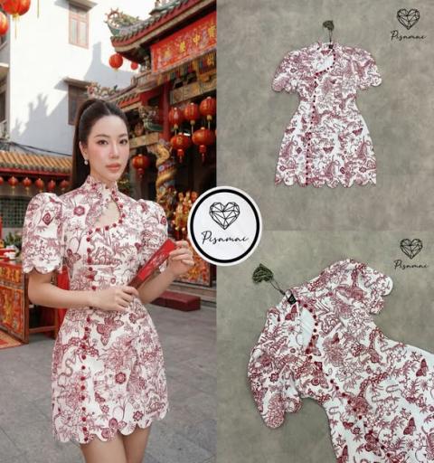เดรสกี่เพ้าทรงแขนตุ๊กตาแต่งขอบหยักมาในลายกราฟฟิกตรุษจีน