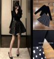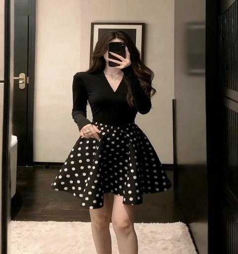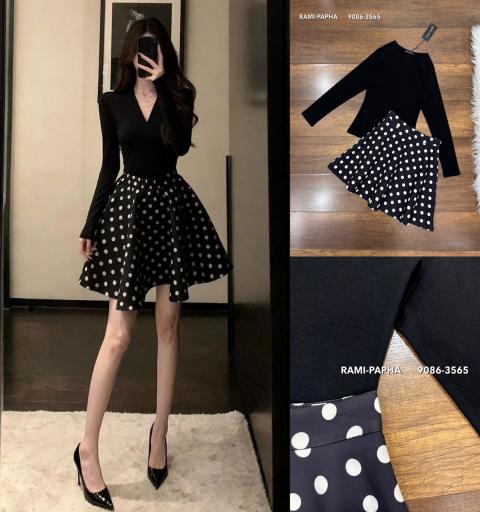 ⚜️Ready to shipping ⚜️Label :: RAMI-PAPHA(รมิปภา) เสื้อยืดสีดำคอวีแขนยาว เนื้อผ้ายืดหยุ่นหนานุ่มเก็บทรงอย่างดี ช่วงไหล่สวยเก๋ ++กระโปรงสีดำลายจุด Polka Dot ทรงสวย ซับในอย่างดีทั้งตัว ซิปหลัง