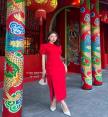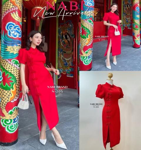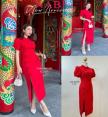 เดรสสีแดงแขนสั้น ดีไซน์แต่งด้วยกระดุมจีนไข่มุกแทบด้านหน้า มีผ่านด้านหน้าขอบเล็มด้วยกุ้นขอบจีน