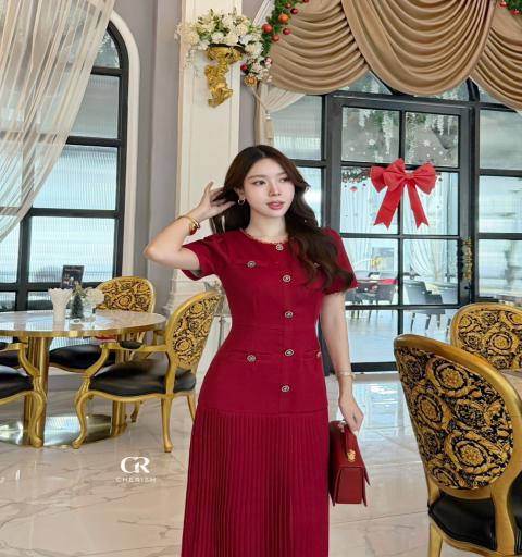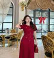 เดรสยาวคอกลม แขนสั้นทรงตุ๊กตา เพิ่มความโดดเด่นด้วยสร้อยสีทองรอบคอ ช่วงเอว