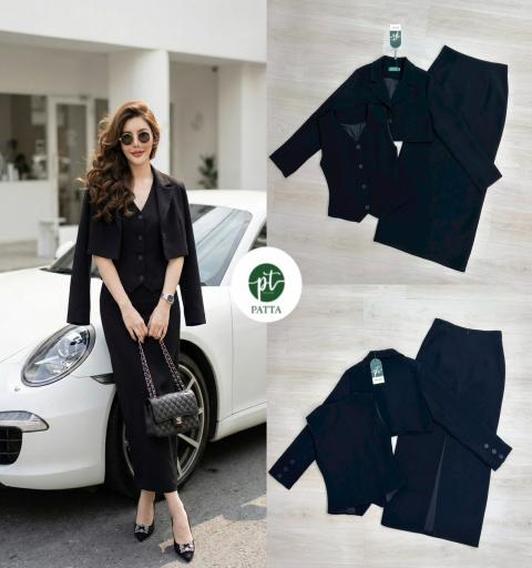 เซต3ชิ้น สีดำ เสื้อคลุมแขนยาวตัวสั้นมีกระดุมหน้า