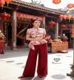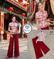 เซ็ตกี่เพ้าตรุษจีนทรงค้างคาวสกรีนลายกราฟฟิก มาคู่กับกางเกงทรงขาบานสีแดงยาว